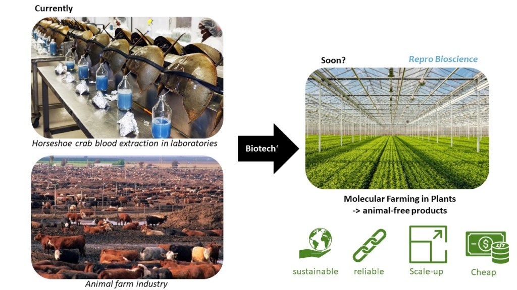 In summary, Repro Bioscience leverages the innovative molecular switch technology to enable large-scale production of recombinant proteins in plants. This approach is applied to two specific products: growth factors for cell cultured meat, aiming to make lab-grown meat more affordable and sustainable, and proteins for endotoxin tests, aiming to eliminate the need for extracting blood from horseshoe crabs and preserve their population. Through these applications, Repro Bioscience seeks to advance scientific innovation and contribute to a more sustainable and ethical future.